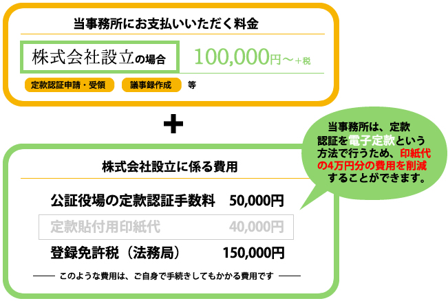 当事務所は、定款認証を電子定款という方法で行うため、 印紙代の4万円分の費用を抑えることができます。