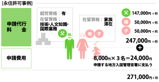 | 永住許可申請 | ・就労資格を有する方の場合:¥147,000+税 ・身分資格を有する方の場合:¥100,000+税 ※ご家族で申請を行う場合、1名あたり¥50,000+税を加算 ![]() |